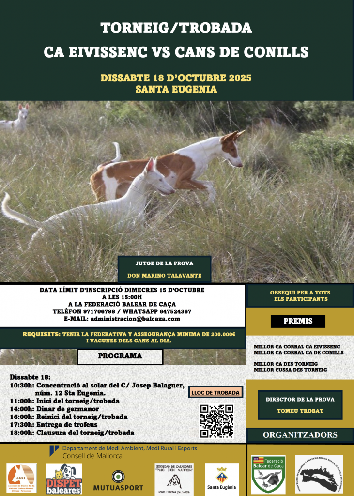 El encuentro, organizado por la Federación Balear de Caza y la Associació de Criadors i Conservadors des Ca de Conills de Menorca, con la colaboración del Departamento de Medio Ambiente, Medio Rural y Deportes del Consell de Mallorca, el Ajuntament de Santa Eugènia, la Associació de Criadors des Ca Eivissenc (Podenco Ibicenco) d’Eivissa i Formentera, MutuaSport, Dispet Baleares y Sociedad de Cazadores «Puig d’en Marron», tiene como objetivo poner en valor las cualidades del Ca Eivissenc y del Ca de Conills, dos razas estrechamente vinculadas a la tradición cinegética de las Illes Balears.