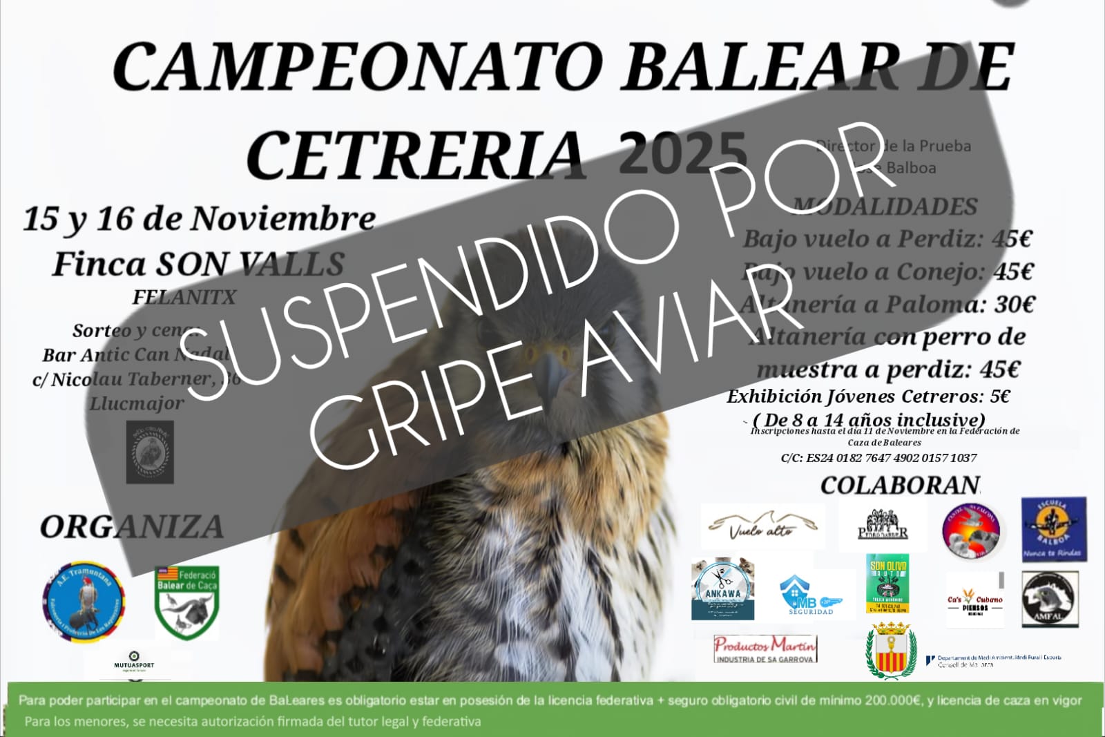 Debido a la entrada en vigor de las medidas de protección establecidas para hacer frente a la gripe aviar en Baleares, según lo publicado en el BOIB nº150 de 13 de noviembre de 2025, la organización del Campeonato de Baleares de Cetrería se ve obligada a cancelar la edición de 2025.