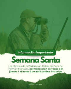 La Federación Balear de Caza informa que, con motivo de la celebración de la Semana Santa, su oficina de Palma permanecerá cerrada desde el jueves 2 hasta el lunes 6 de abril, ambos inclusive.