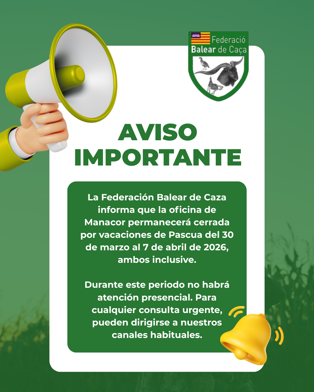 La Federación Balear de Caza informa que la oficina de Manacor permanecerá cerrada con motivo de las vacaciones de Pascua del 30 de marzo al 7 de abril de 2026, ambos inclusive.