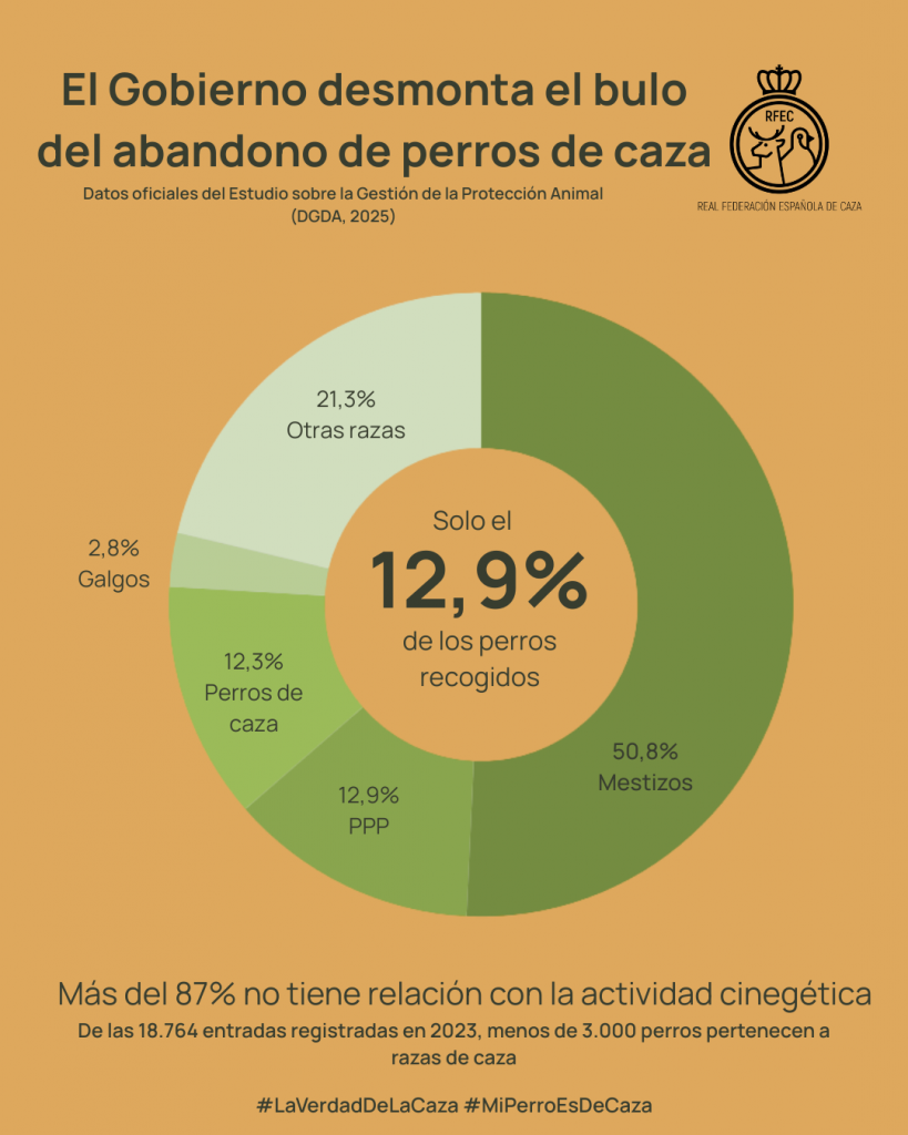 Dato central: ➡️ Solo el 12,9 % de los perros recogidos son de razas de caza, lo que significa que el 87,1% no tienen que ver con la actividad cinegética ➡️ Menos de 3.000 perros realmente perdidos o abandonados en toda España. Compártelo...